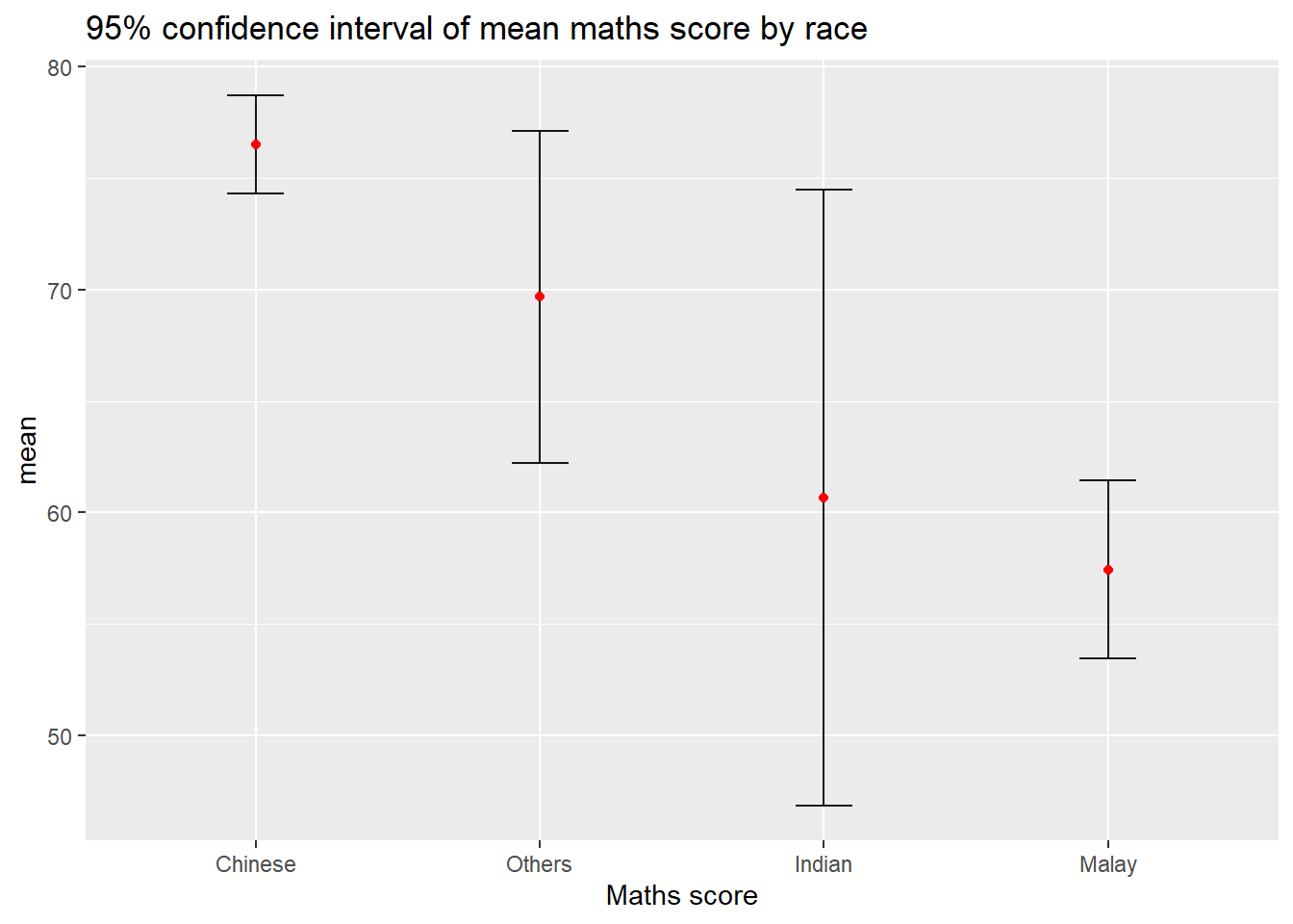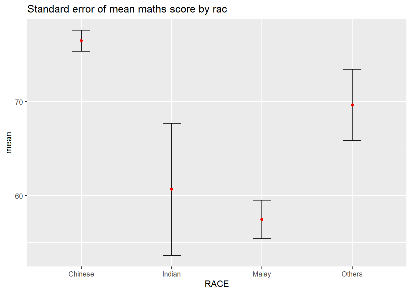 Now we are ready to plot the standard error bars of mean maths score by race as shown below.