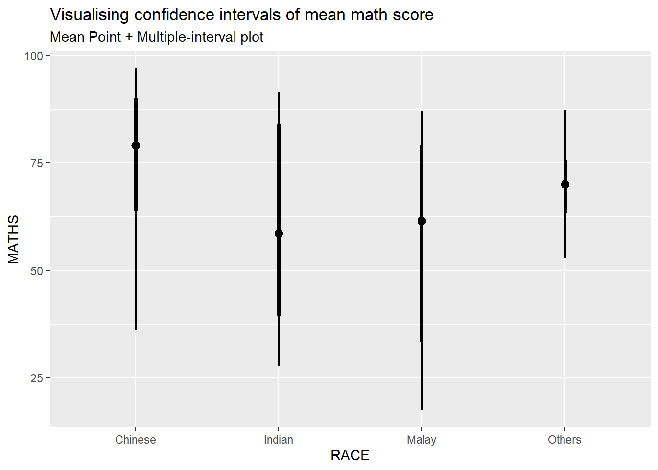 In this section, we will learn how to plot error bars of maths scores by race by using data provided in exam tibble data frame.